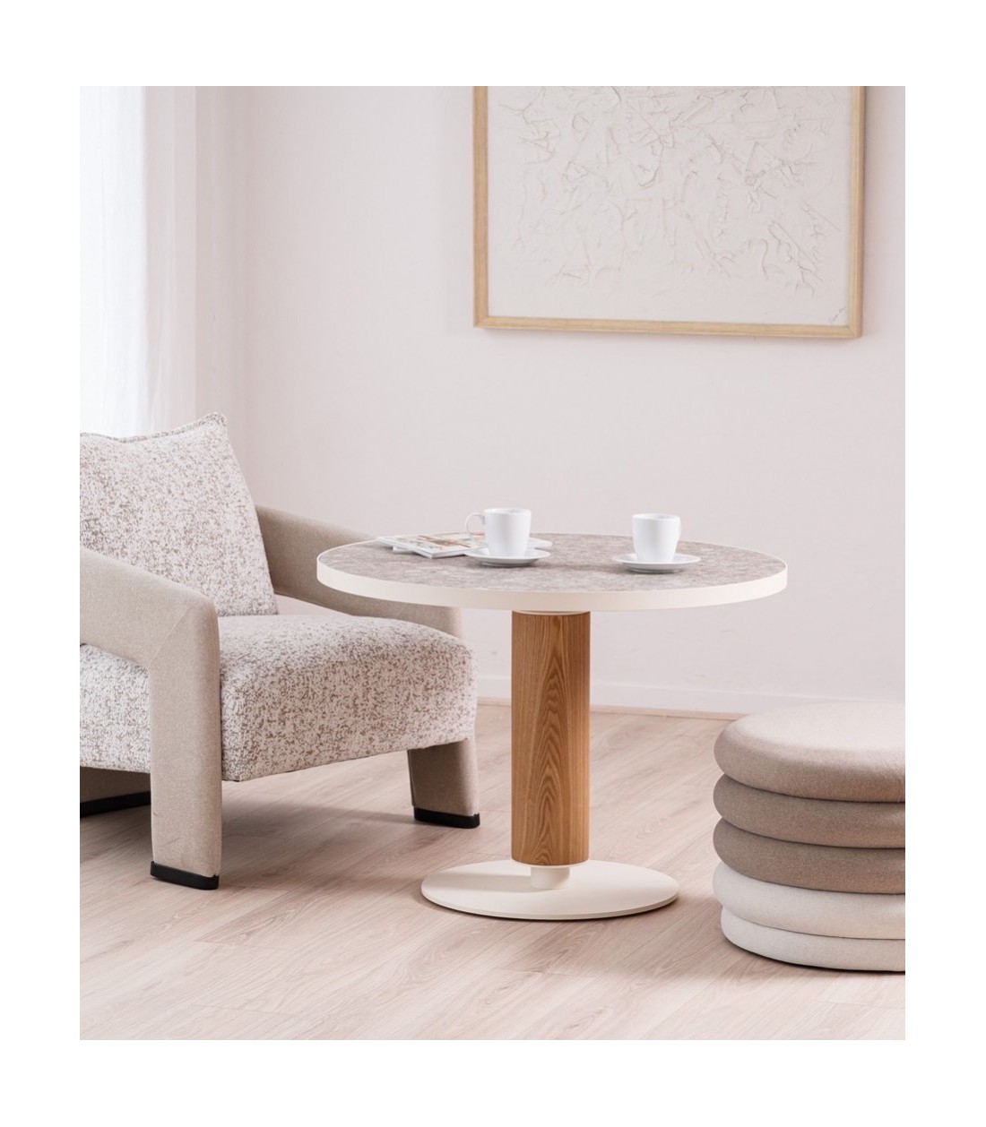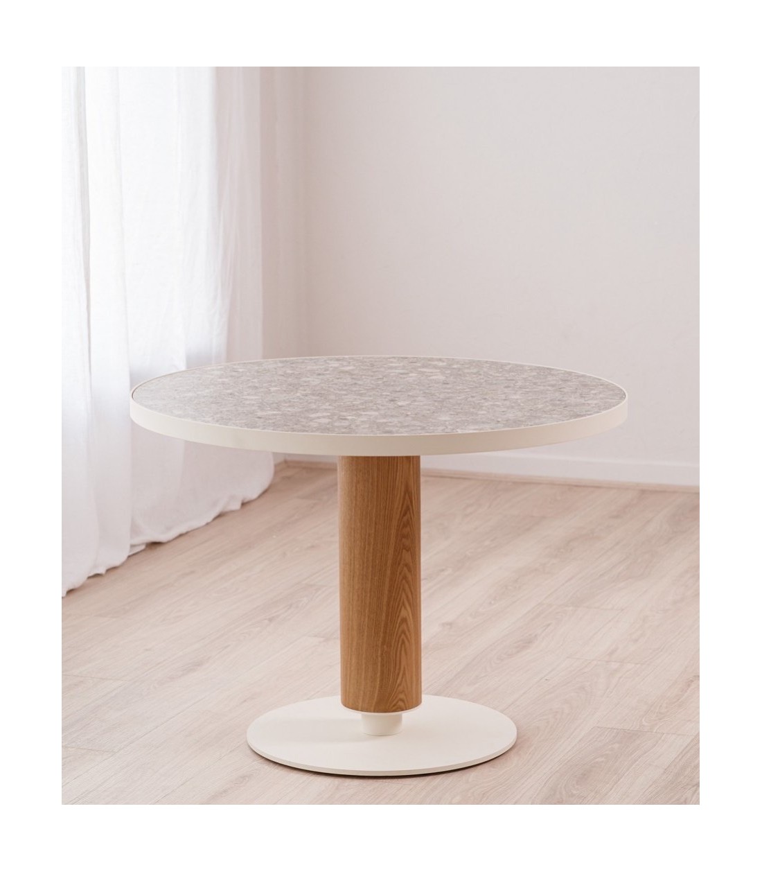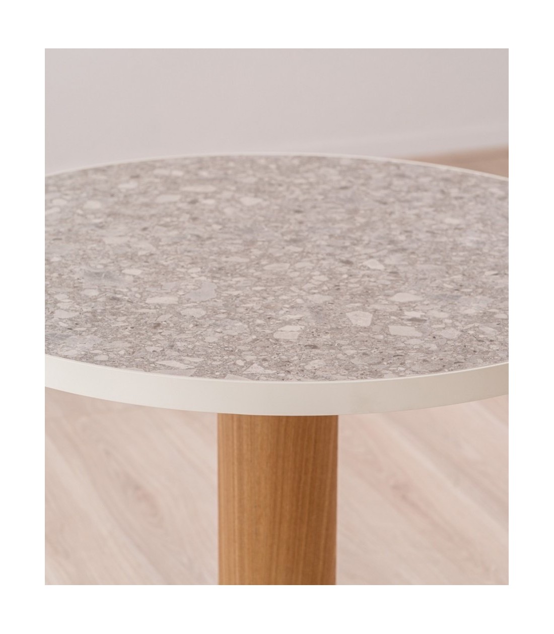 Mesa redonda de 90 cm con sobre cerámico acabado terrazzo en grises y base cilíndrica en chapa de fresno natural con detalles metálicos en laca beige.