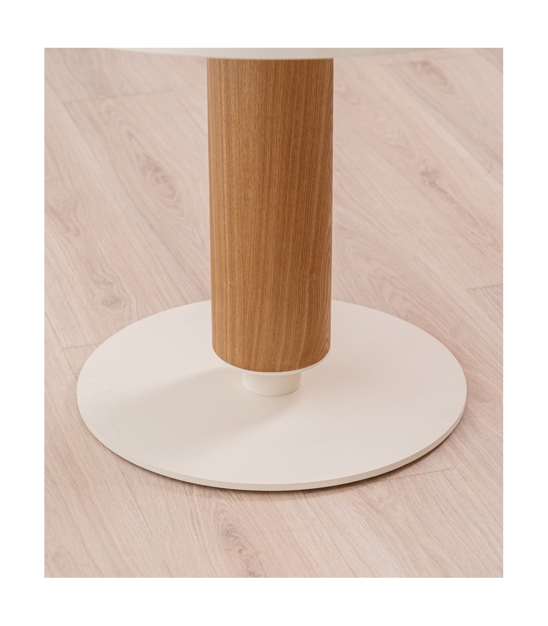 Diseñada para aportar presencia arquitectónica en proyectos de hostelería, restauración o espacios residenciales, esta mesa redonda de 90 cm de diámetro y 65 cm de altura combina diseño, nobleza de materiales y funcionalidad. Su sobre cerámico acabado en terrazzo en tonos grises ofrece dinamismo visual, alta resistencia al uso intensivo y un acabado mate que potencia su carácter atemporal. La base retoma la identidad formal de la colección con una estructura cilíndrica central revestida en cálida chapa de fresno natural que transmite autenticidad, mientras que las piezas metálicas superior e inferior, lacadas en beige, aportan un contraste elegante y sutil. La base circular metálica, también lacada en beige, refuerza la estabilidad y la coherencia estética del conjunto. Cada pieza es única gracias a las variaciones naturales del patrón cerámico, lo que convierte a esta mesa en una opción versátil y sofisticada para zonas lounge, salones contemporáneos o espacios de espera.