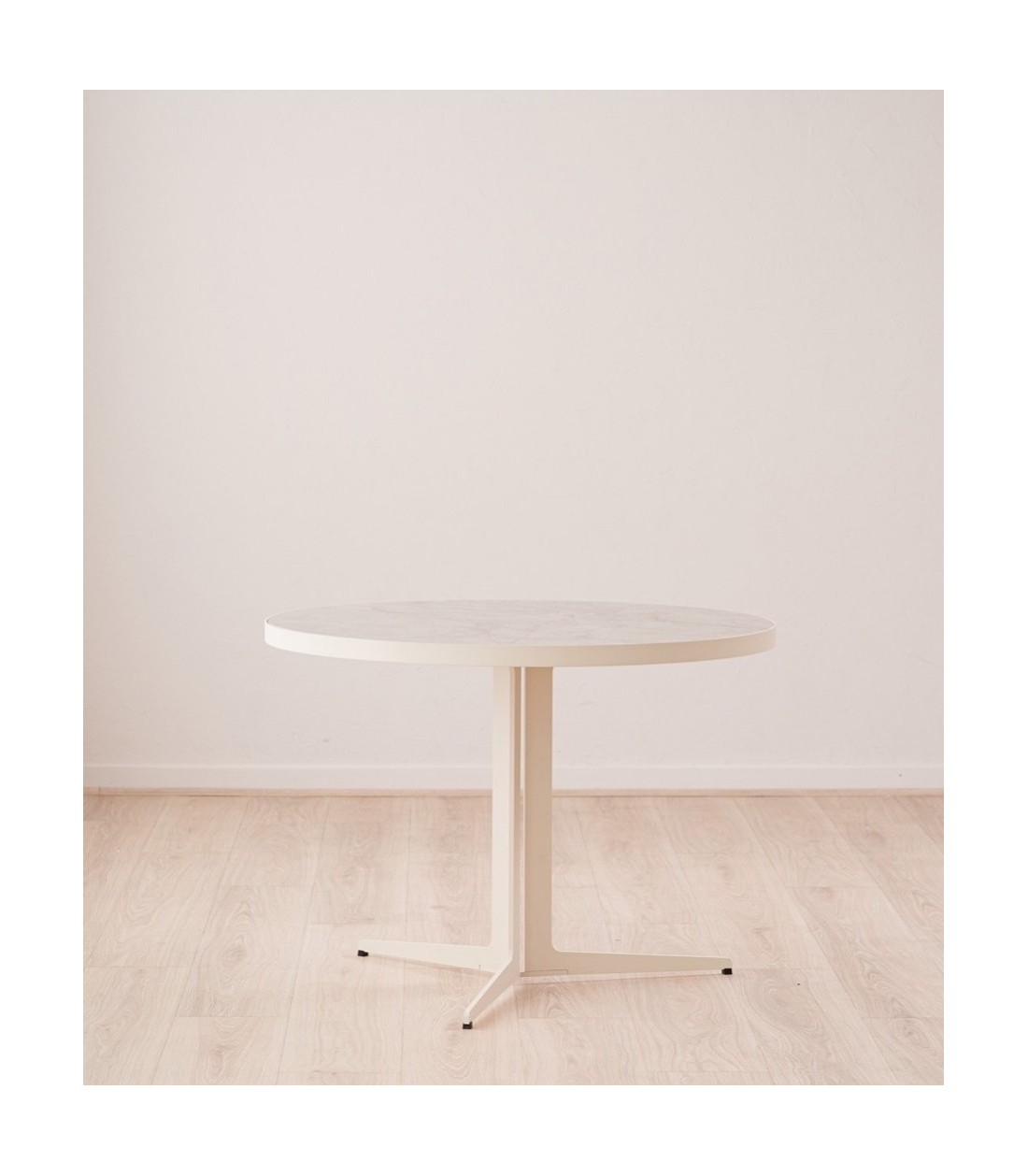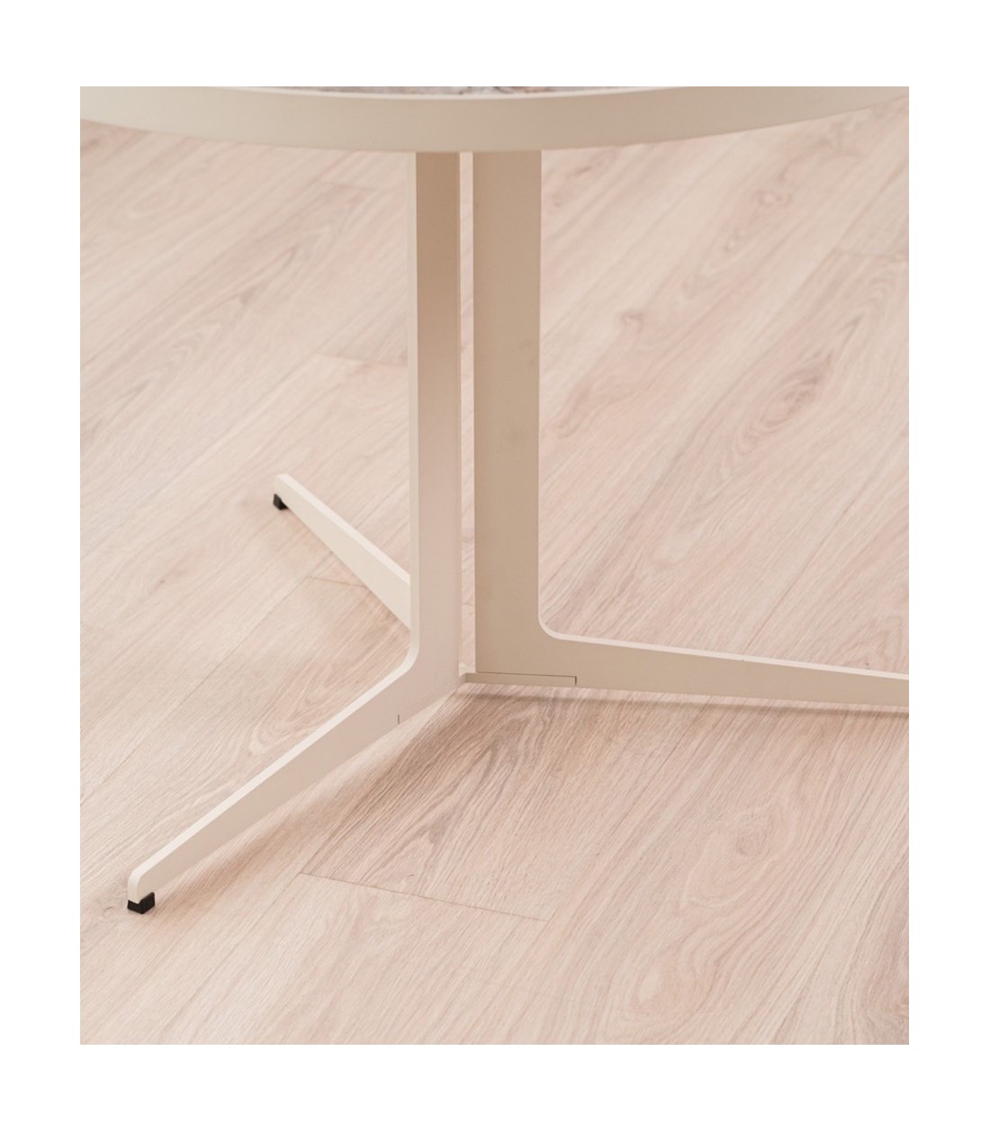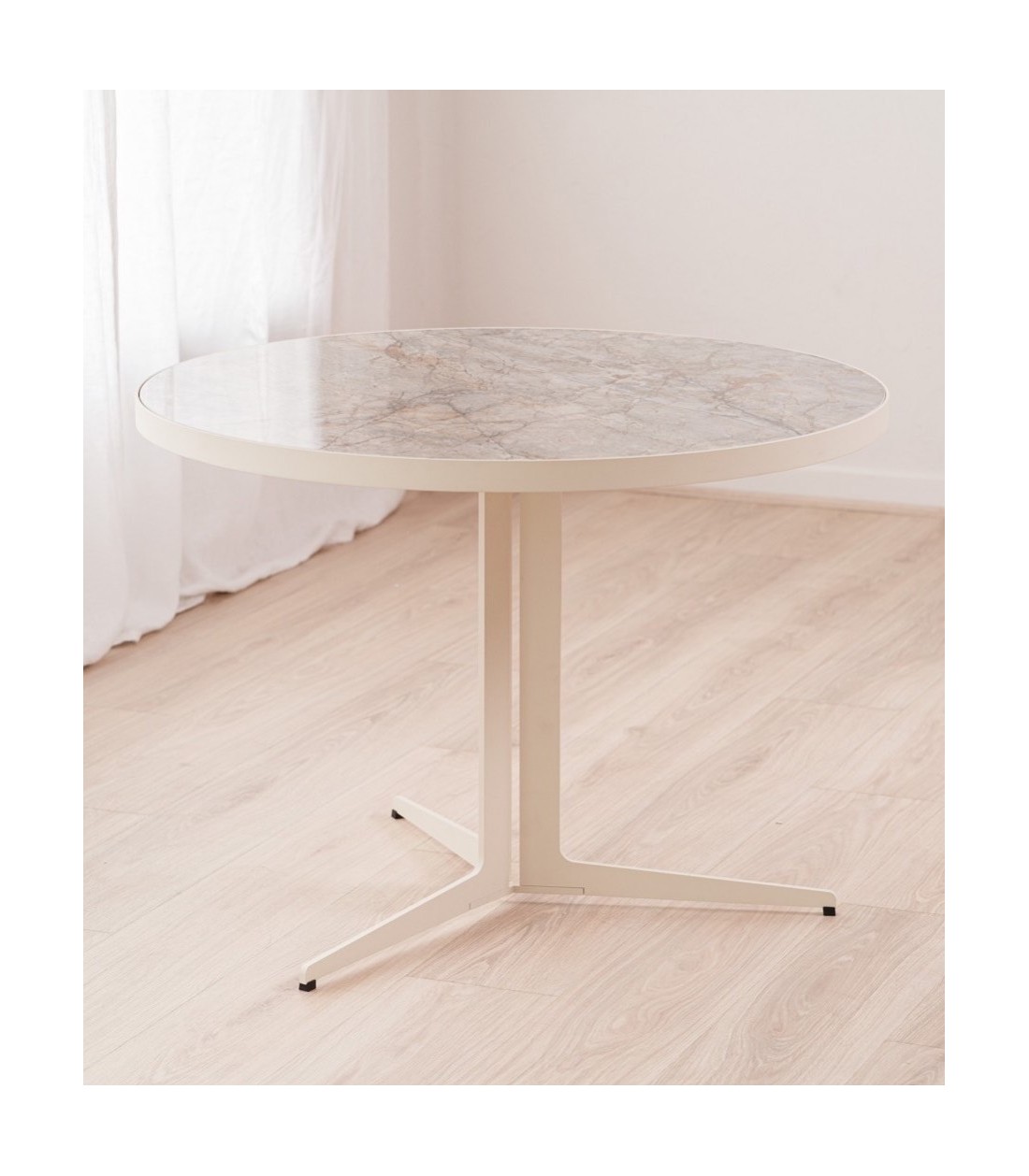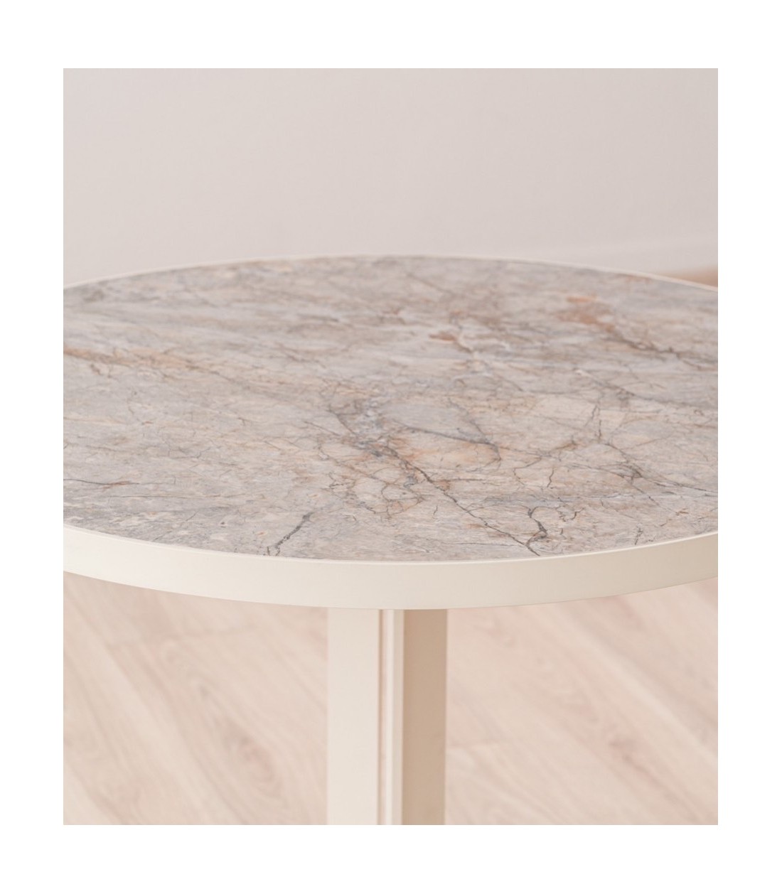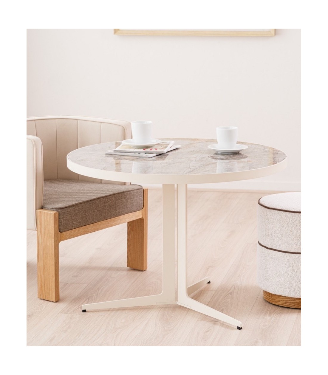 Concebida para espacios lounge, áreas de espera en hoteles, cafeterías o proyectos residenciales, esta mesa redonda de 90 cm de diámetro y 65 cm de altura combina carácter, diseño y funcionalidad. Su sobre cerámico en acabado brillo reproduce con gran realismo los matices de la piedra natural en tonos grises y ocres, aportando sofisticación y riqueza visual. Descansa sobre un tablero de DM y está enmarcado por una chapa metálica lacada en beige que protege el canto y realza la coherencia estética del conjunto. La base metálica, compuesta por tres piezas macizas lacadas en beige, forma una estructura sólida y estable, con un diseño tipo trípode que ofrece ligereza visual y un impacto contemporáneo. Polivalente y resistente, esta mesa es ideal para ambientes contract que buscan soluciones duraderas con una estética cuidada. Cada tablero cerámico es único y puede presentar variaciones en sus patrones, acentuando su carácter exclusivo.