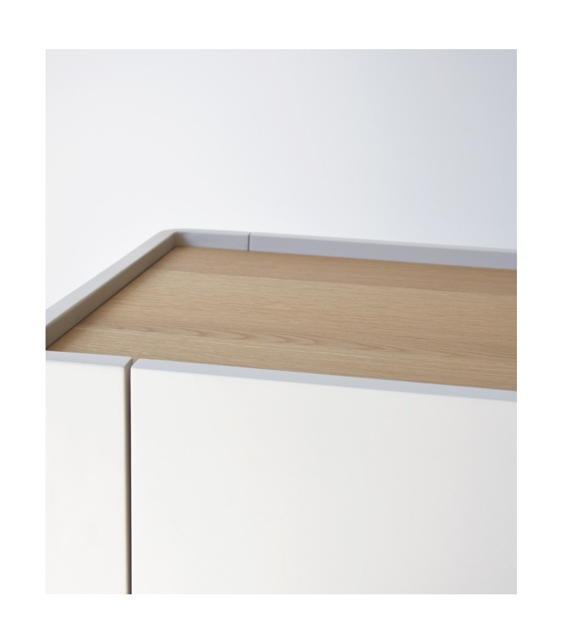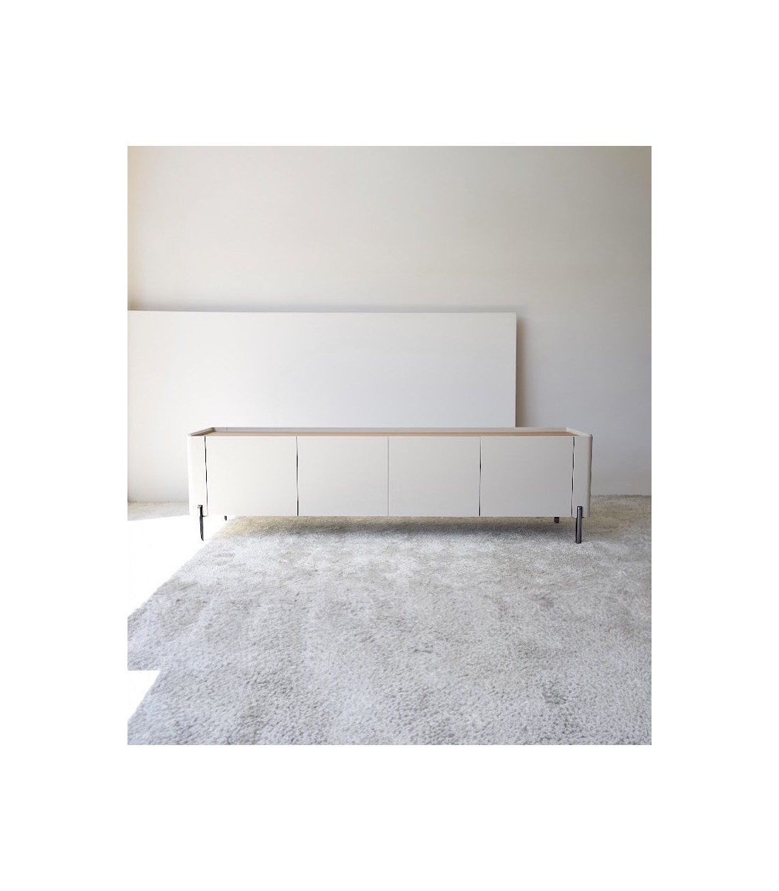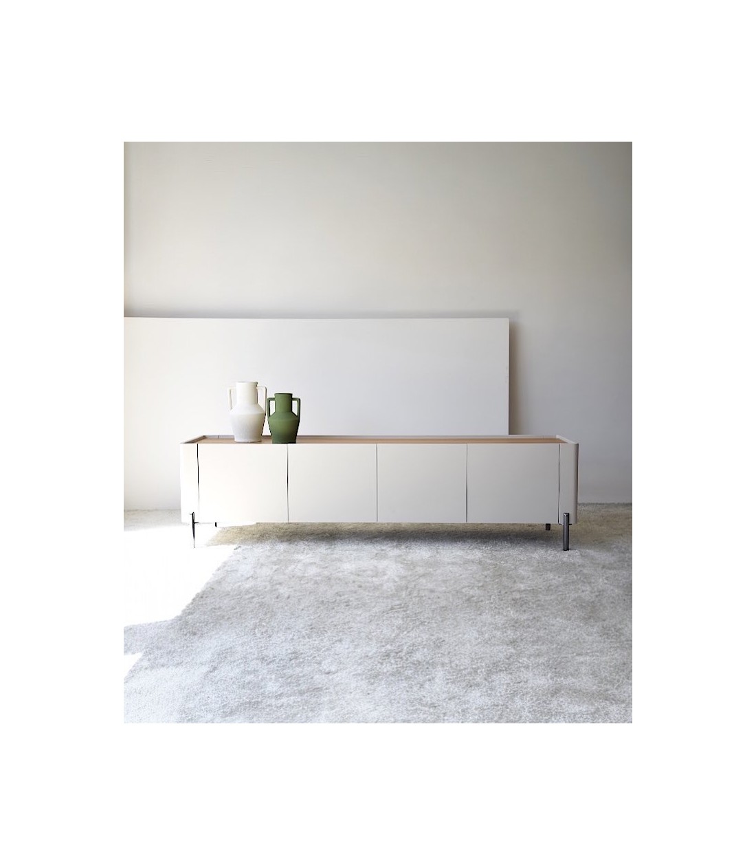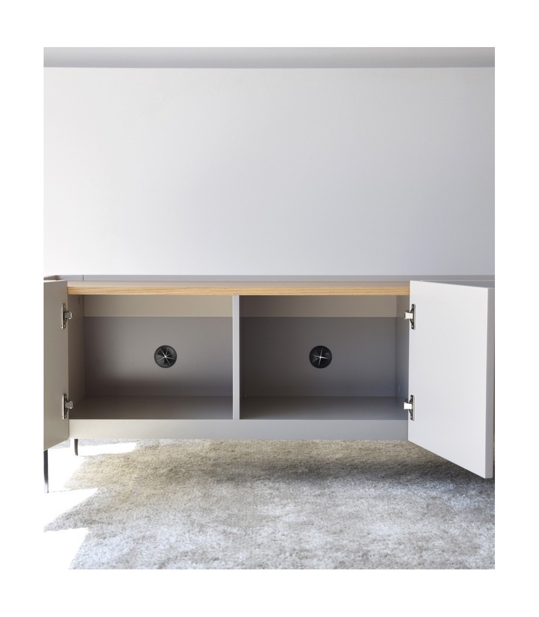 MUEBLE DE TELEVISIÓN REALIZADO EN DM LACADO EN TONO GRIS ARENA CON ACABADO MATE Y PARTE SUPERIOR RECHAPADA EN MADERA DE ROBLE NATURAL. PIEZA DE MOBILIARIO DE LÍNEAS SUAVES Y SINUOSAS CON BORDES REDONDEADOS Y DISEÑO ATEMPORAL CAPAZ DE APORTAR UN ORDEN PERFECTO A CUALQUIER ESPACIO DE TU VIVIENDA. LA COMBINACIÓN DEL LACADO MATE CON LA MADERA DE ROBLE DA COMO RESULTADO UNA PIEZA DE MOBILIARIO CÁLIDO Y CONTEMPORÁNEO. LAS PATAS DE NIQUEL OSCURO ESTÁN INTEGRADAS EN EL DISEÑO APORTANDO UN GRADO DE SOFISTICACIÓN AL MUEBLE. EL CUERPO PRINCIPAL ESTÁ FORMADO POR 4 PUERTAS CON APERTURA SUAVE Y SENCILLA.