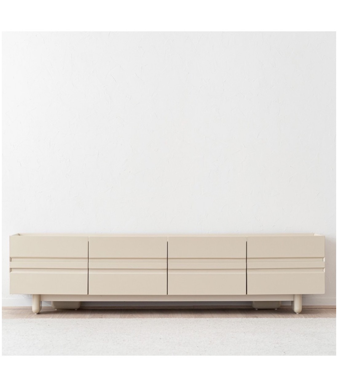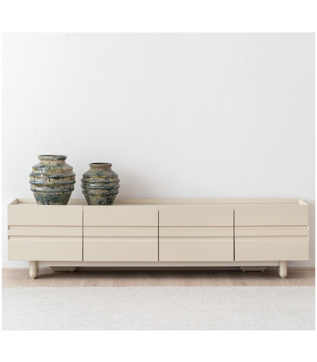 Mueble de TV en DM lacado en beige alto brillo con sobre en cerámico mate gris-blanco, base en madera maciza lacada con líneas redondeadas, diseño ligero con tirador integrado y 4 puertas.