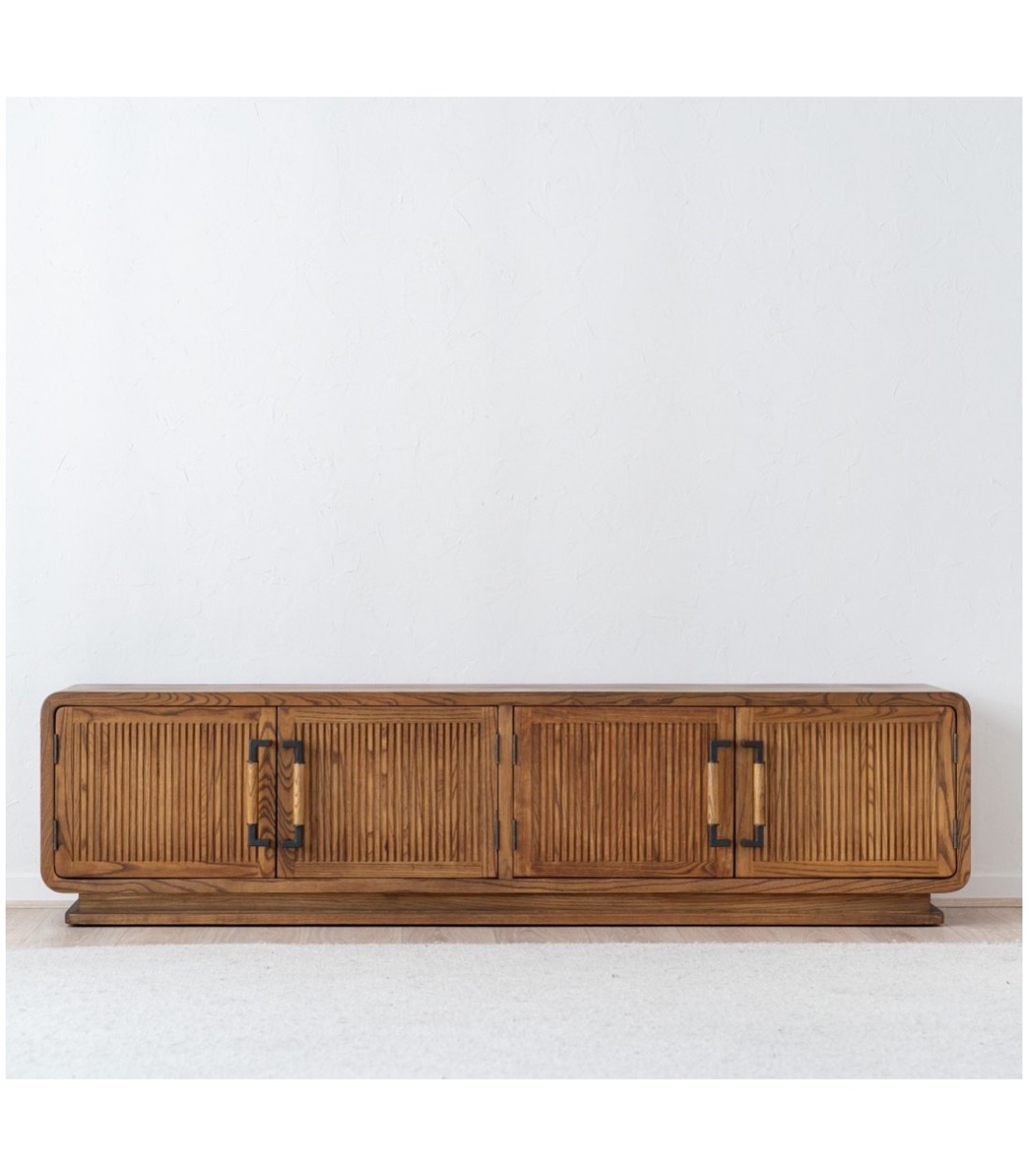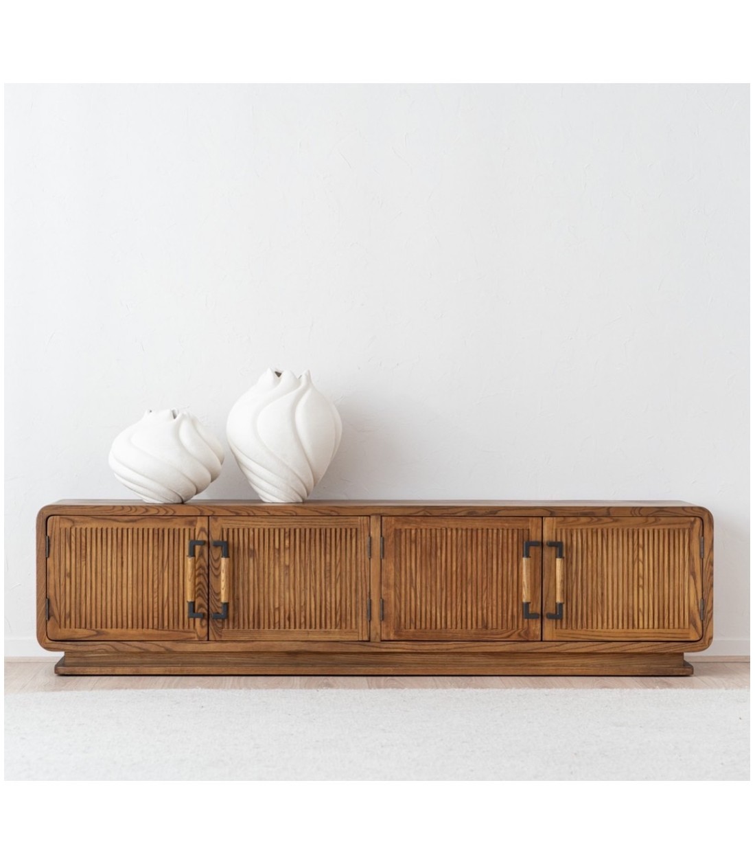 Mueble TV Herea en tablero rechapado de fresno natural con patas de madera maciza, cuatro puertas con baldas interiores, puertas acanaladas y tiradores metálicos negro mate con detalle en fresno, de diseño cálido y elegante.