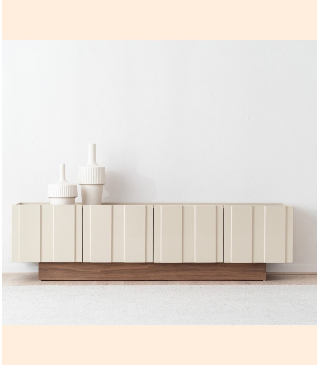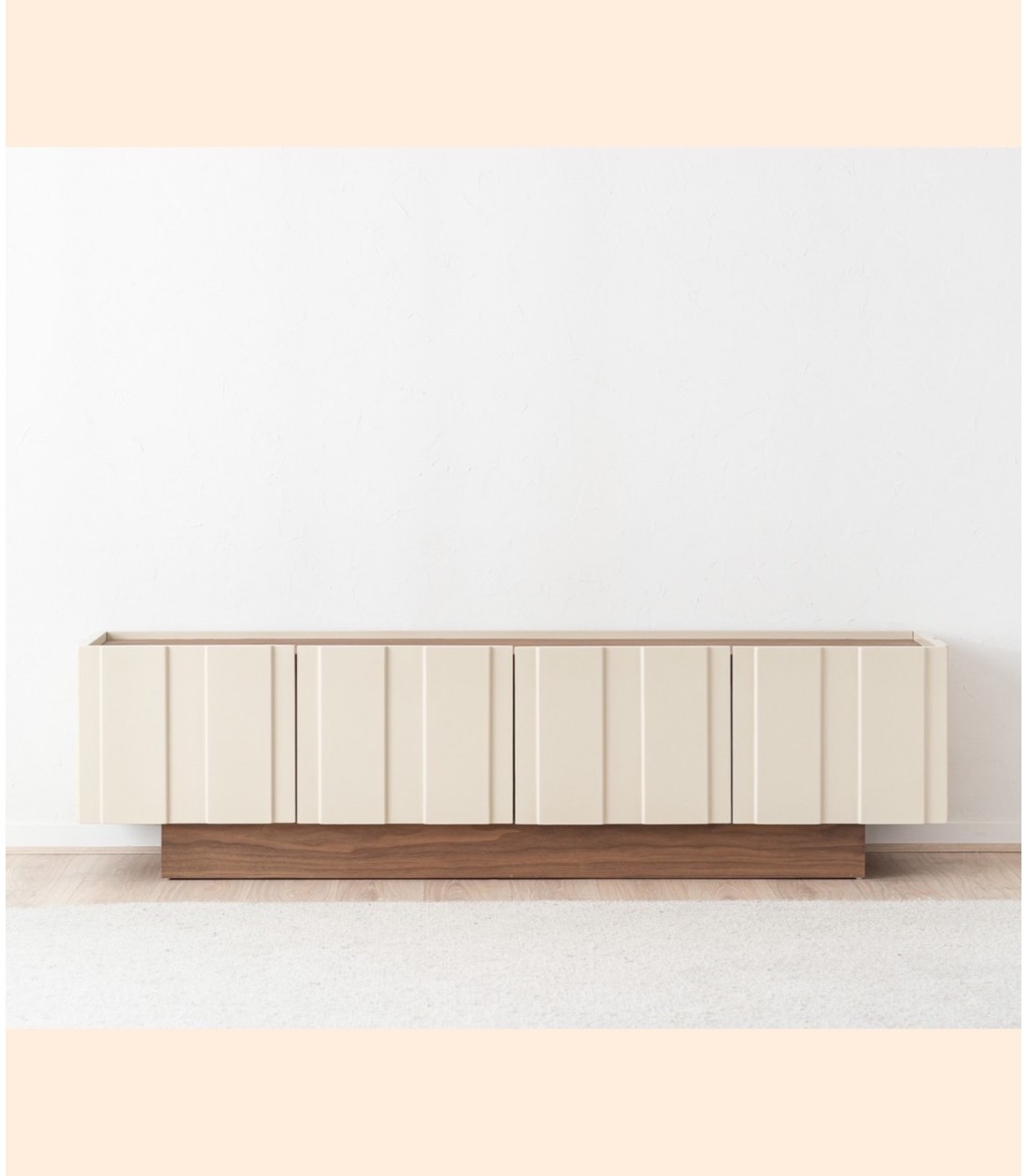 Mueble de TV en DM lacado en alto brillo beige suave, con sobre y base en chapa de nogal, diseño con relieve en paños verticales, base retrasada que aporta ligereza y 4 puertas de almacenamiento.