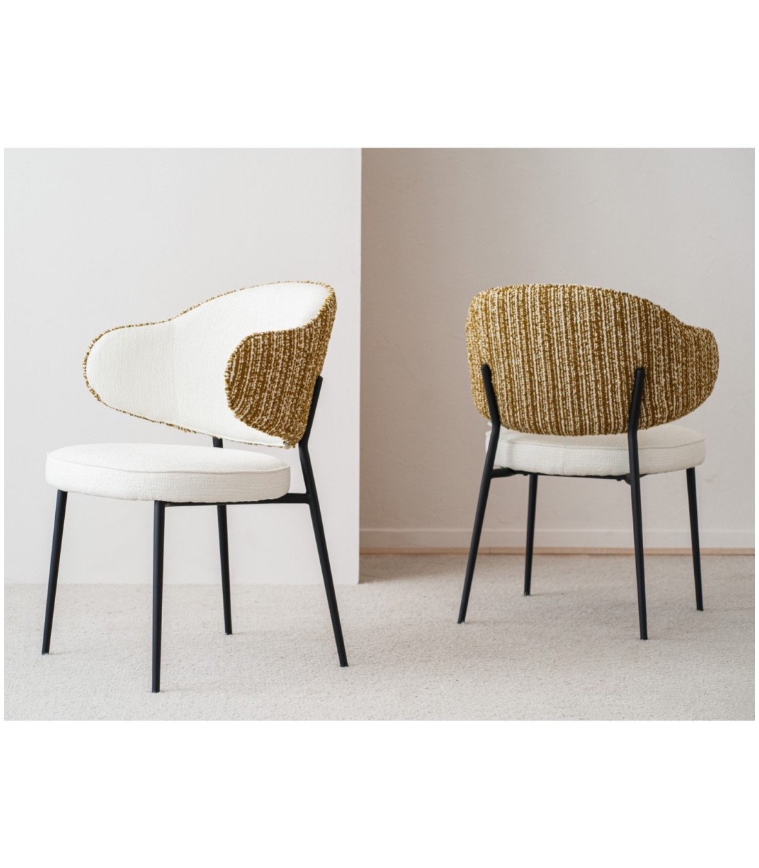 Set de 2 sillas de comedor con interior en tejido blanco roto, trasera en tela mostaza y blanca de textura gruesa, y patas metálicas negras de estilo contemporáneo.