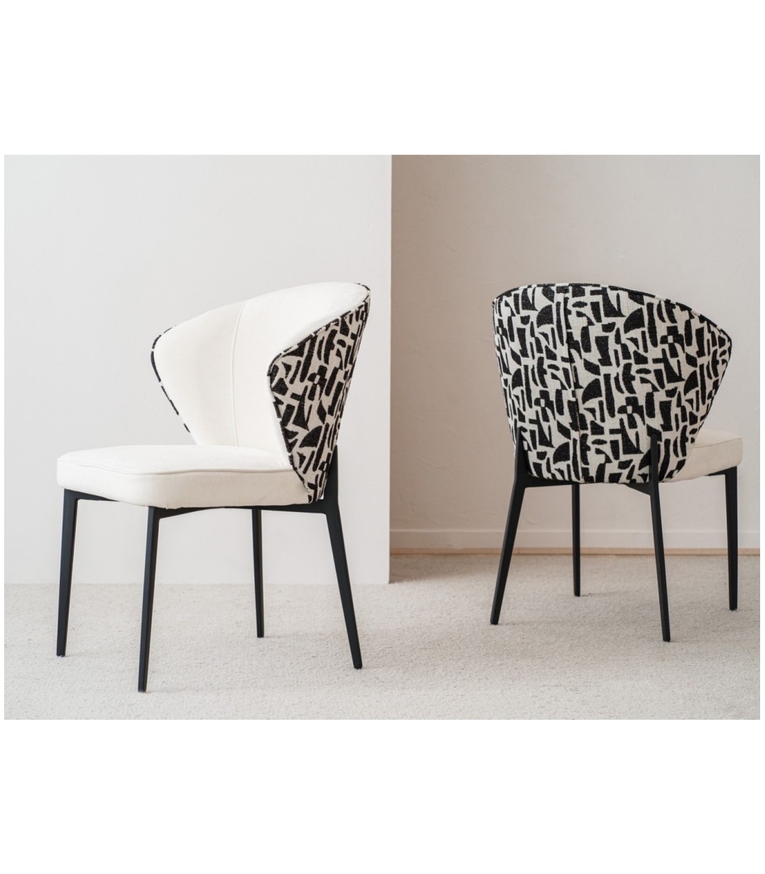 Set de 2 sillas de comedor en tono marfil claro con trasera en tejido geométrico beige y negro, patas metálicas negras y diseño atemporal.