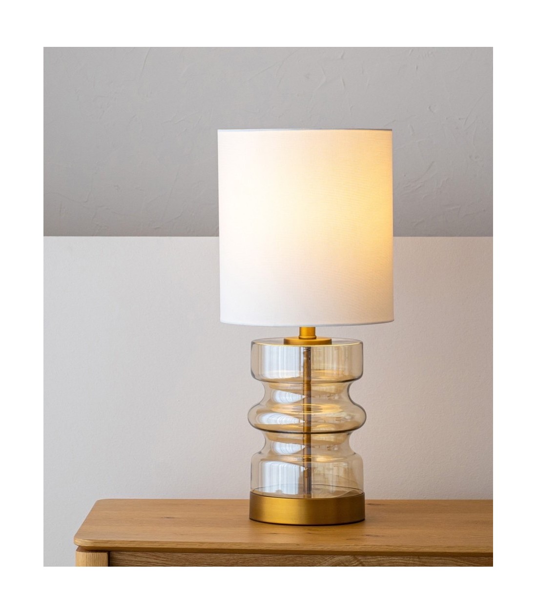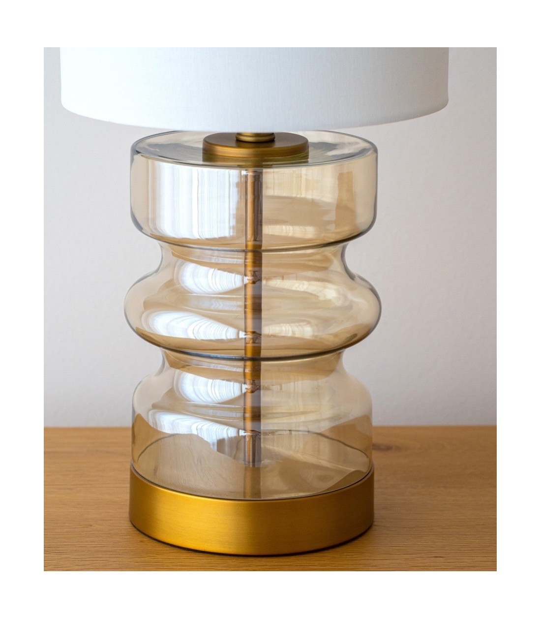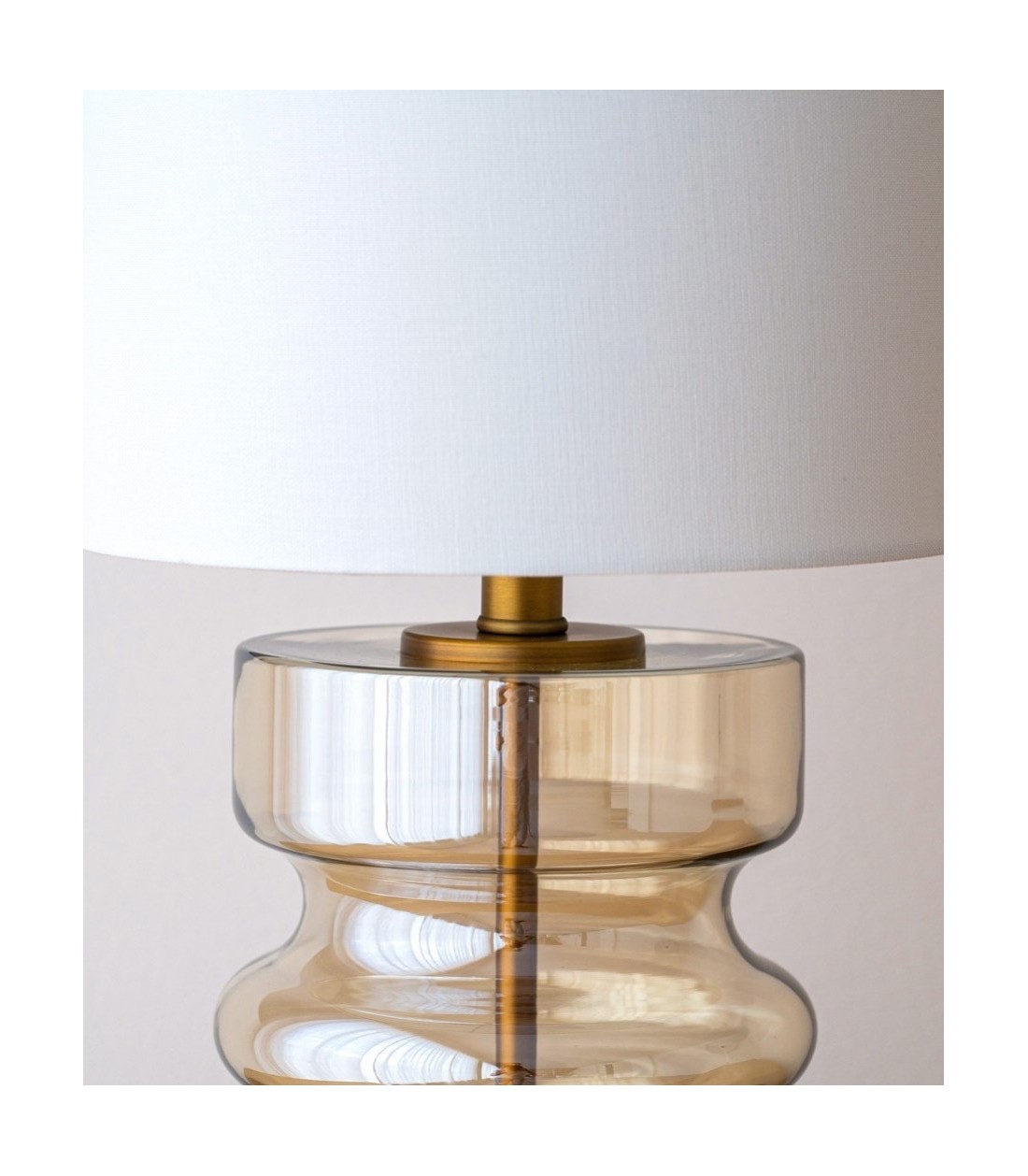 Lámpara de mesa Cilla N2, base de vidrio ámbar transparente con soporte de metal en acabado oro envejecido, pantalla cilíndrica de lino blanco, ideal para aportar calidez y estilo a cualquier espacio.