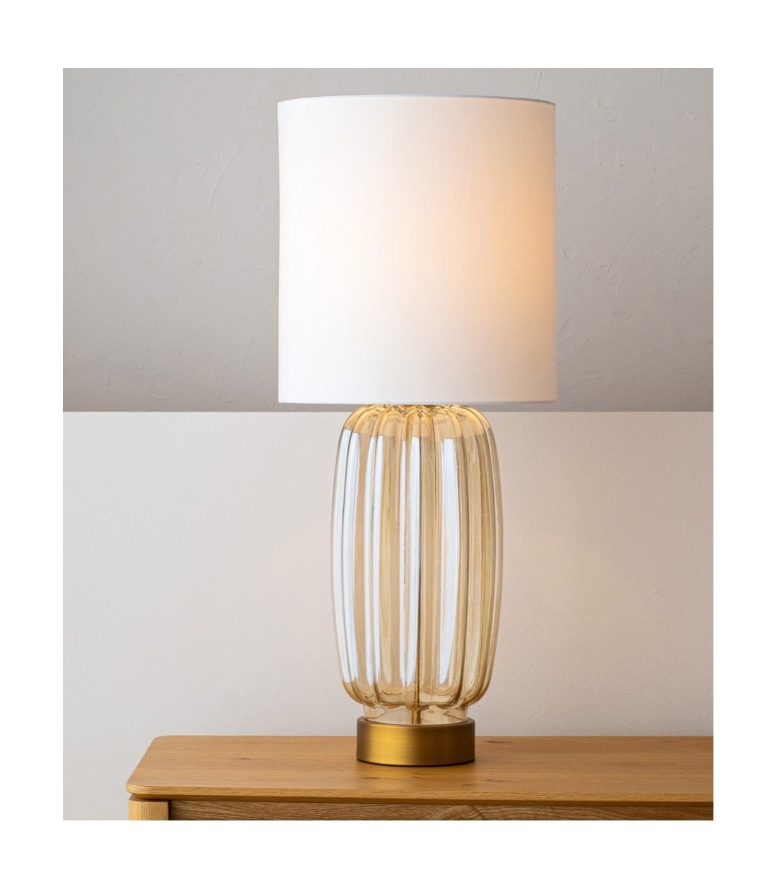 Lámpara de mesa Irea, base de vidrio ámbar transparente con soporte de metal en acabado oro envejecido, pantalla cilíndrica de lino blanco, ideal para aportar calidez y elegancia a cualquier espacio.