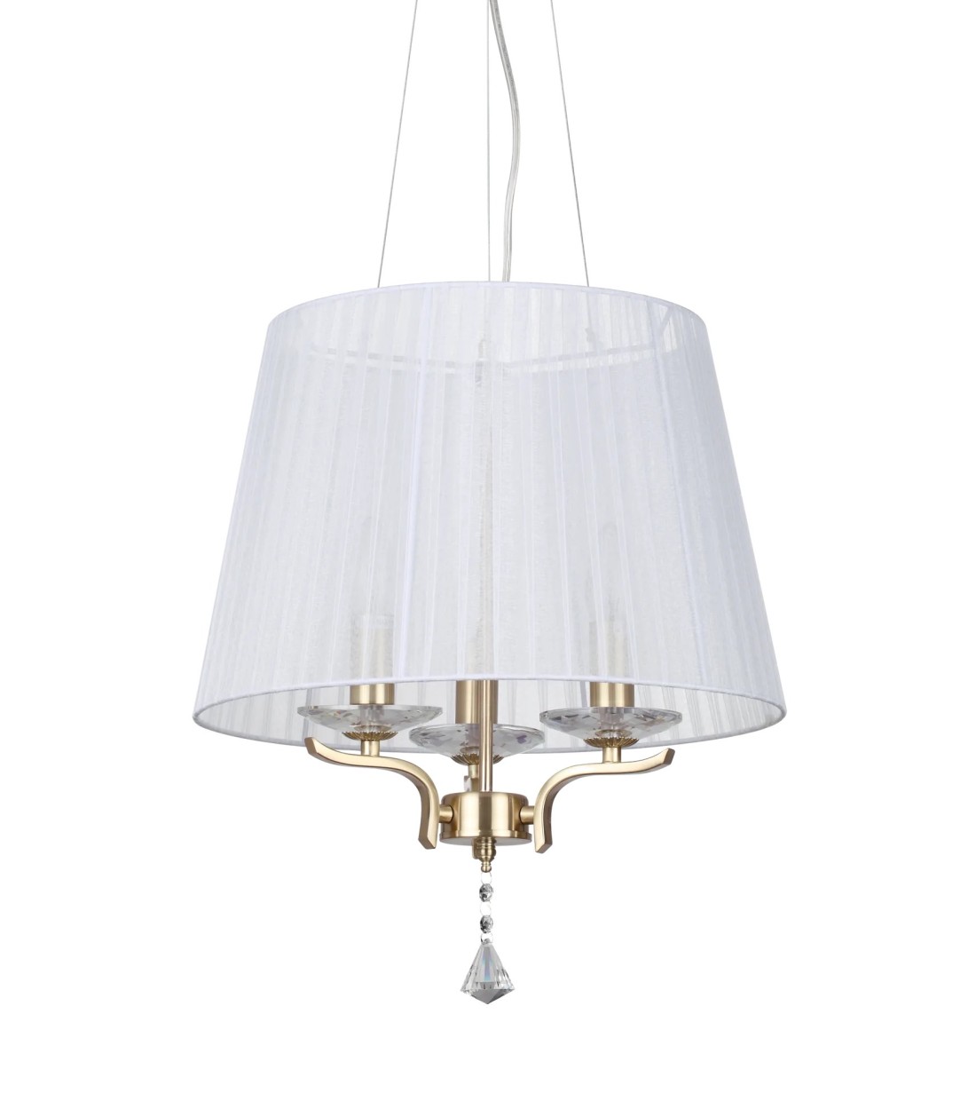 Lámpara de techo colgante en metal con detalles en cristal amolado, pantallas de organdí y cubre cadena en terciopelo. Color latón. Utiliza 3 bombillas E14 (no incluidas) máx. 3x28W.