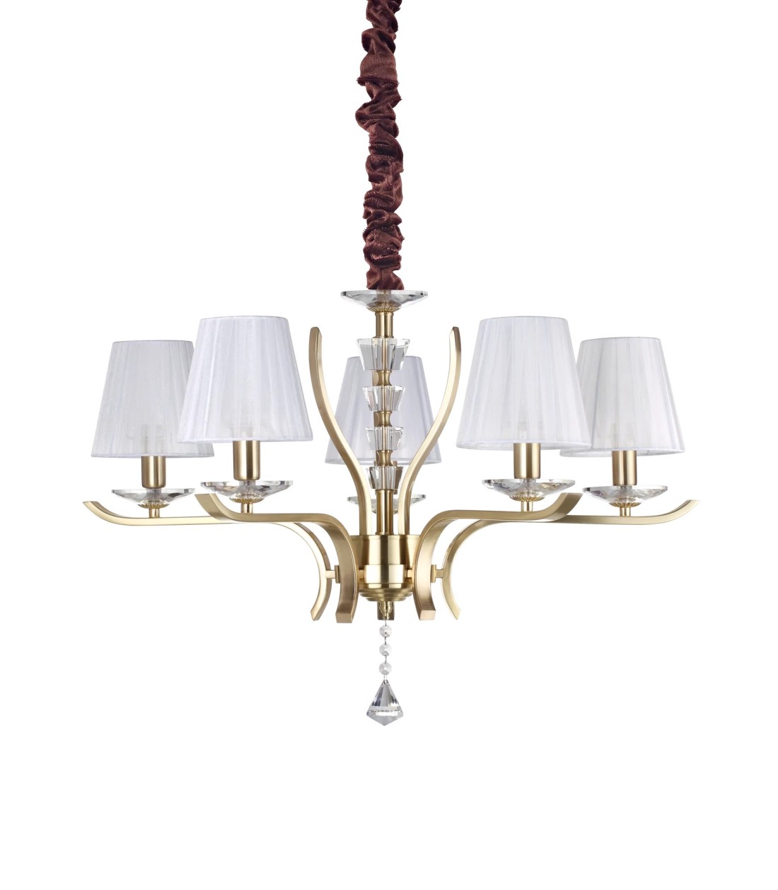 Lámpara de techo colgante en cristal amolado con pantallas de organdí y cubre cadena en terciopelo. Color latón. Utiliza 5 bombillas E14 (no incluidas) máx. 5x28W, 3000k.
