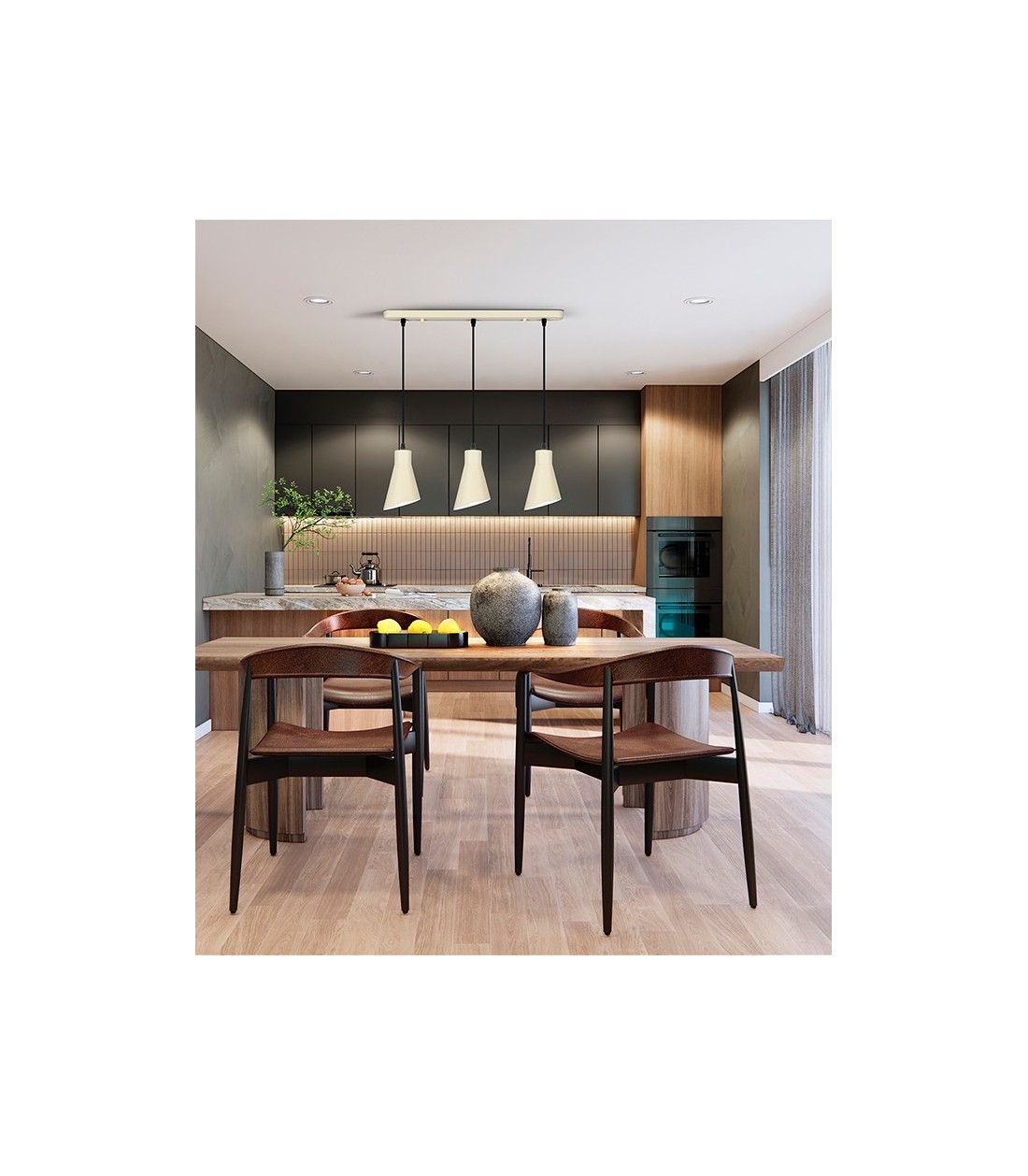 Lámpara colgante de tres luces fabricada en metal con un elegante acabado crema satinado que aporta luminosidad y calidez al ambiente. Su diseño sencillo y equilibrado la convierte en una opción versátil para espacios como comedores, cocinas o salones. La altura regulable permite adaptarla fácilmente a cada estancia, ofreciendo una iluminación personalizada. Equipada con tres portalámparas E27, permite elegir las bombillas más adecuadas según la intensidad o el tono de luz deseado, combinando funcionalidad con un estilo suave y contemporáneo.
