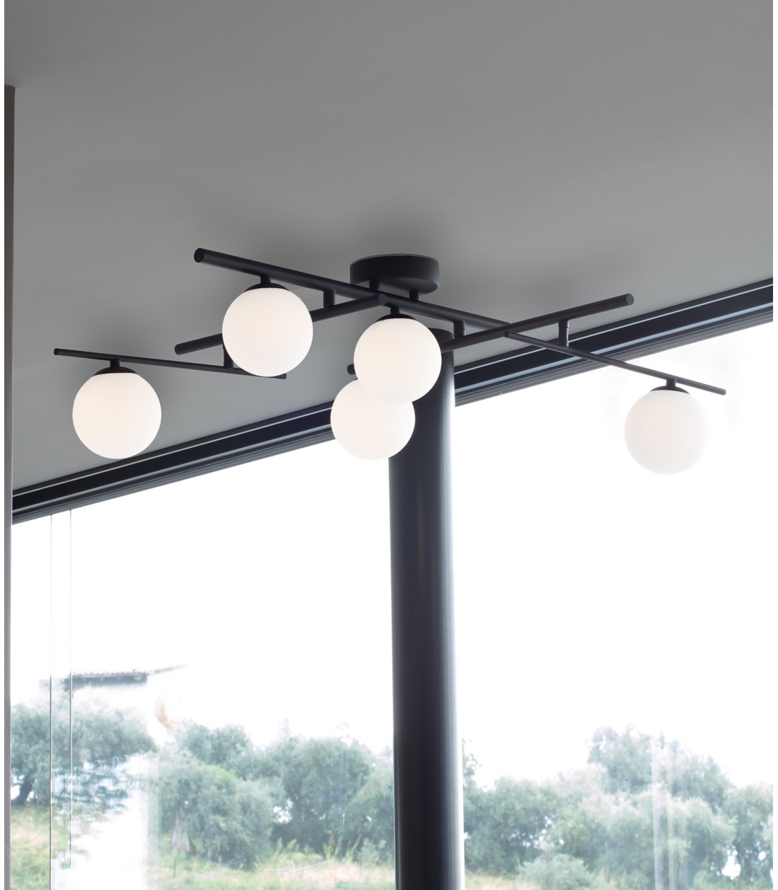 Plafón de techo en metal barnizado en negro con brazos posicionables y difusores de vidrio soplado blanco al ácido. Utiliza 5 bombillas G9 5x3W, 3000k.