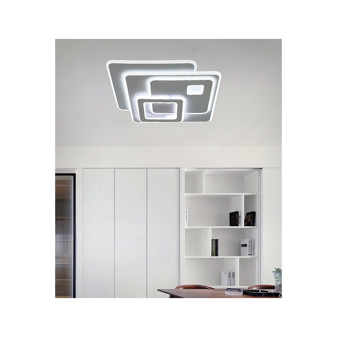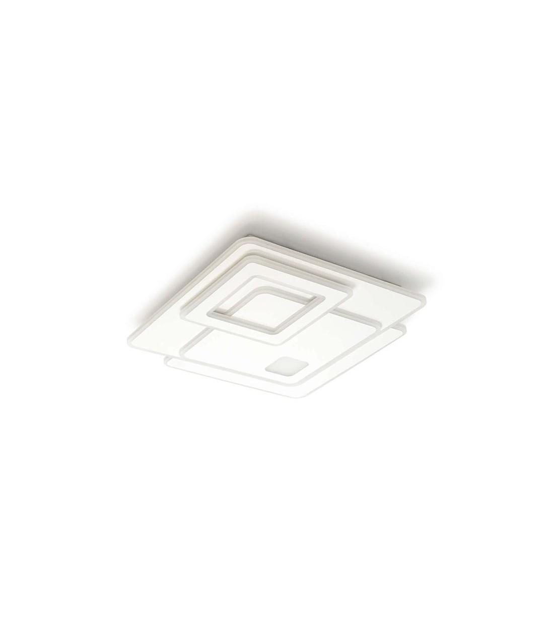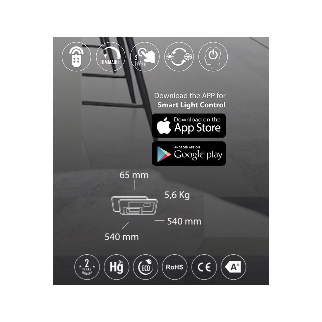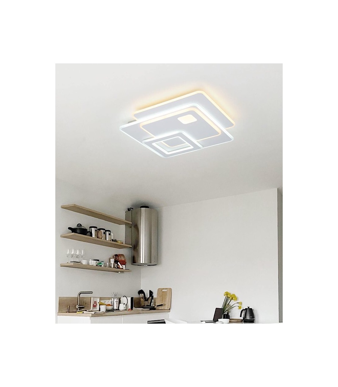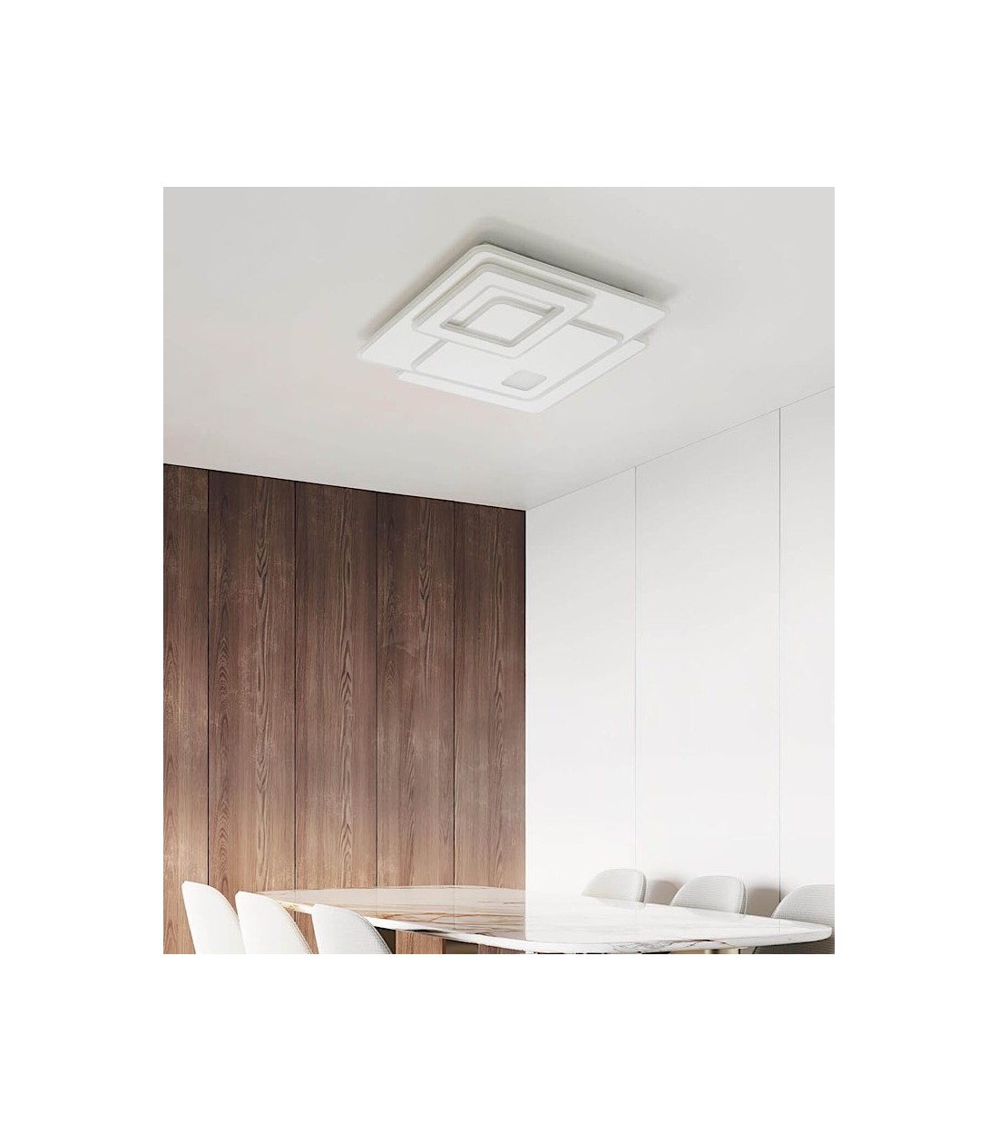 Plafón de techo Smart bluetooth con múltiples configuraciones combinando cuadros con luz blanca y cálida. Regulable en intensidad. Controlable con mando a distancia y con móvil o tablet mediante App gratuita. Fabricado en acero y acrílico color blanco. Tonalidad regulable de 3500K a 6500K. Memoria de encendido. Potente iluminación: 14.600 lúmenes.